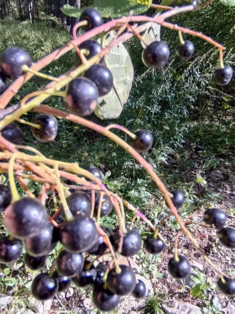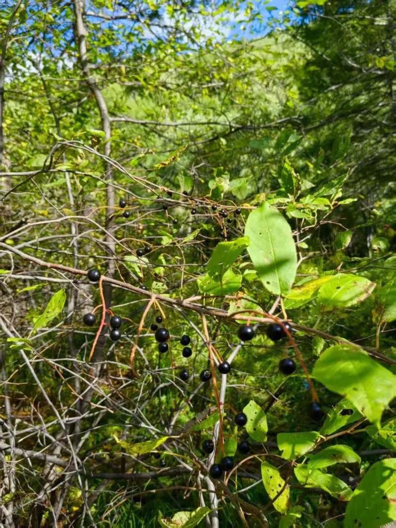 调查中,志愿者发现了大量稠李子树。这种植物的果实是黑熊喜爱的食物之一。果实呈黑紫色,成簇生长在树枝上,常见于森林中湿润的环境。
