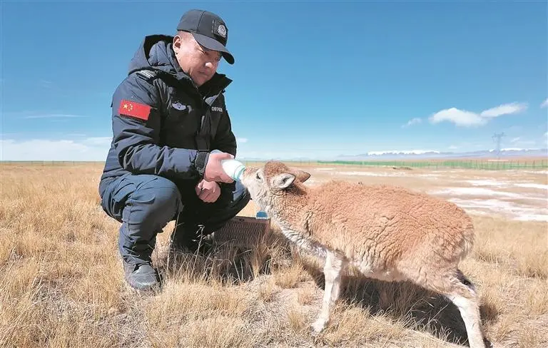 2023年,闹布东周被调往卓乃湖保护站,“我们每天出去巡护,遇到受伤的小藏羚羊或者失去母亲的藏羚羊,都会小心翼翼地救回保护站。”闹布东周说,刚出生的小藏羚羊身体虚弱,不会用奶嘴喝奶,他们就以嘴对嘴的方式喂牛奶。